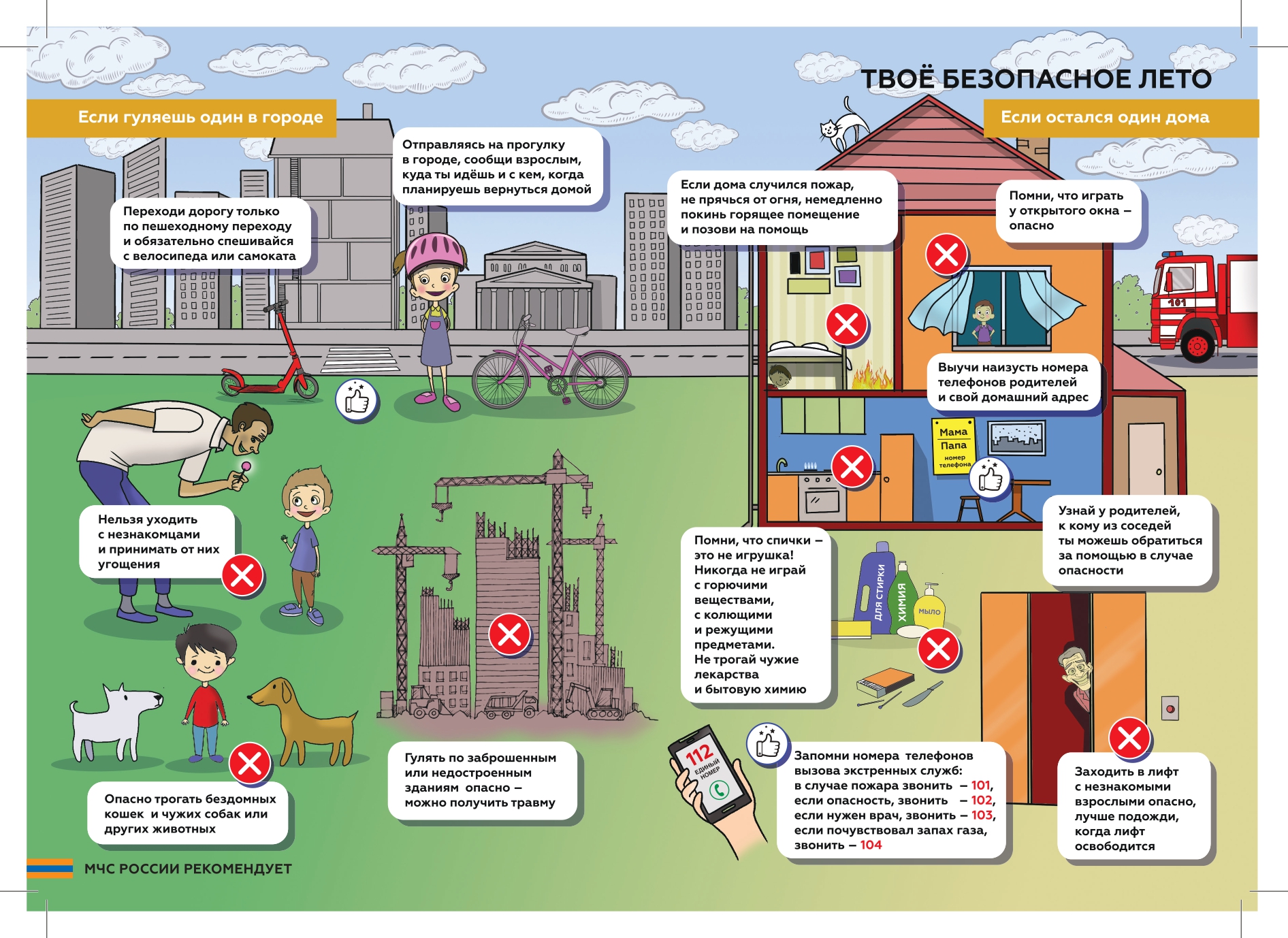 Следует также обязательно провести с детьми беседы, разъяснив им правила безопасного поведения на дорогах и улице и безопасного поведения на воде, а также в нештатных ситуациях, которые могут возникнуть с ними во время отсутствия взрослых.