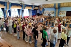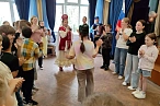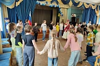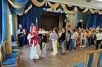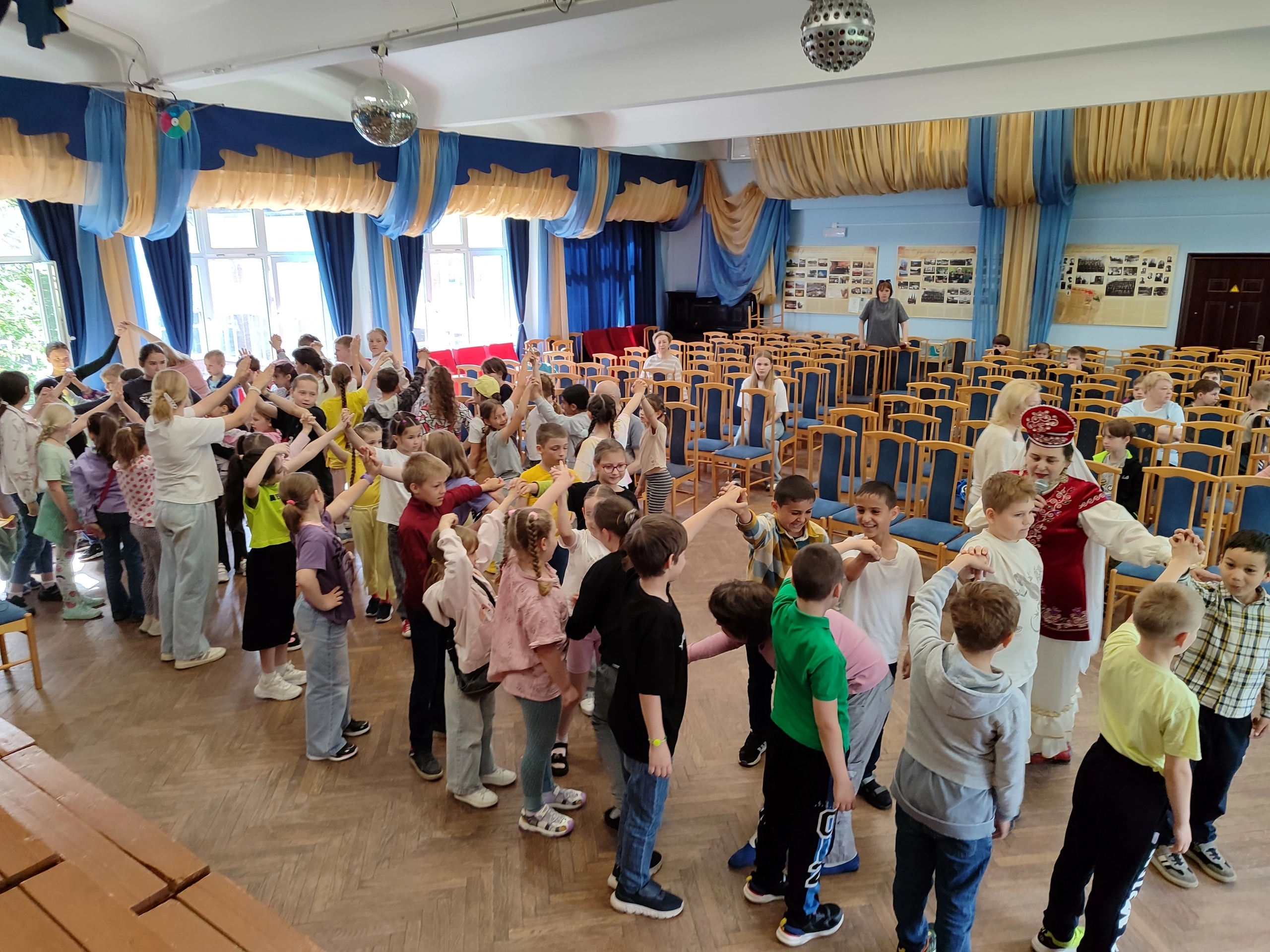Ещё ребята с удовольствием пели песни вместе с артистами ансамбля, но, пожалуй, наибольшее удовольствие детям принесли активные и познавательные совместные игры, такие как «Ручеёк» и «Тюбетейка».