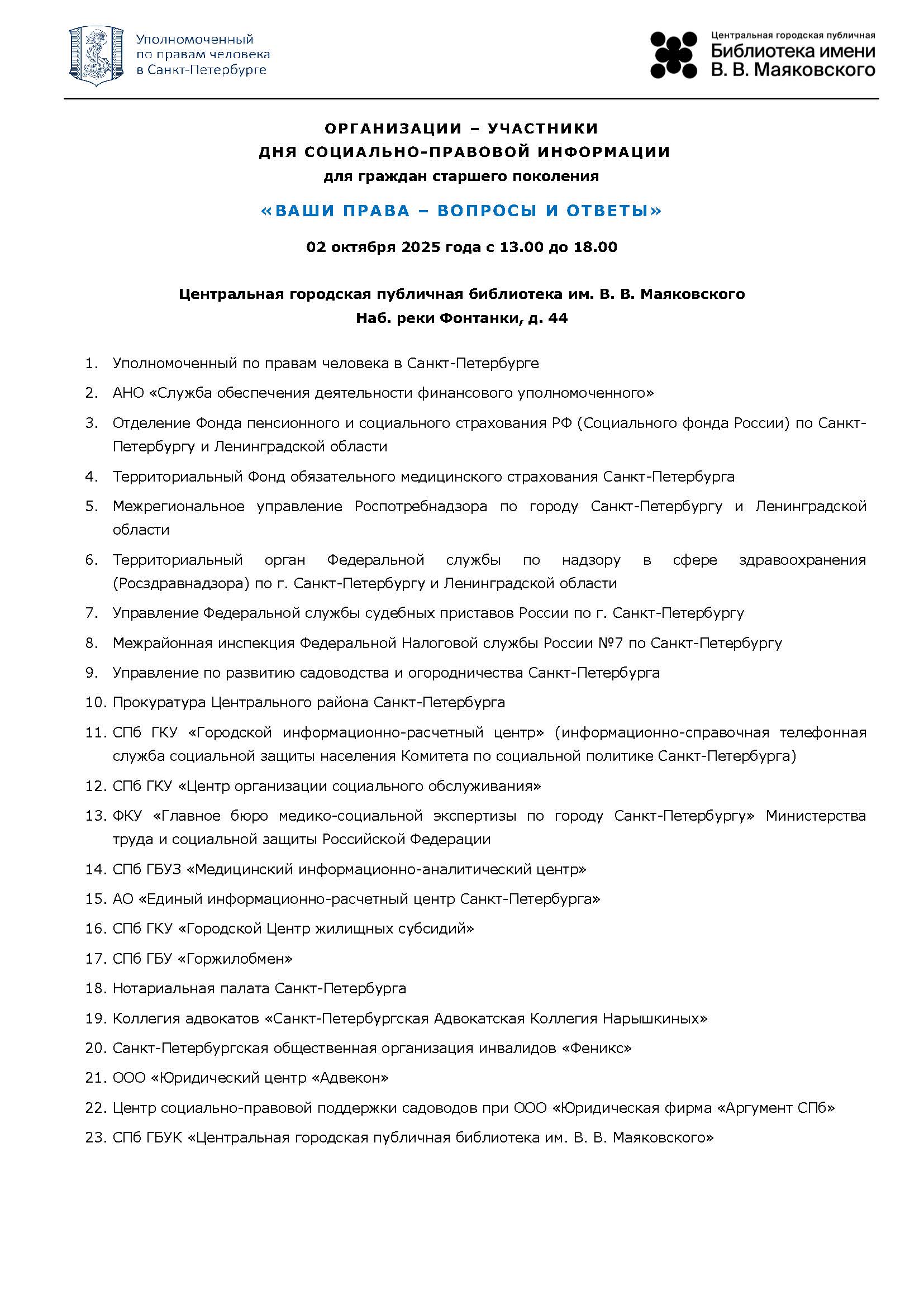 ГУ «Территориальный фонд обязательного медицинского страхования Санкт-Петербурга», информационно-справочная служба Комитета по социальной политике Санкт-Петербурга, СПб ГКУ «Центр организации социального обслуживания», Территориальный орган Росздравнадзора по г. Санкт-Петербургу, ФКУ «Главное бюро медико-социальной экспертизы по городу Санкт-Петербургу», СПб ГБУЗ «Медицинский информационно-аналитический центр», Управление Федеральной службы судебных приставов по Санкт-Петербургу, Нотариальная палата Санкт-Петербурга, Межрайонная инспекция Федеральной налоговой службы России №7 по Санкт-Петербургу, СПб ГБУ «Горжилобмен», АО «Единый информационно-расчетный центр Санкт-Петербурга», СПб ГКУ «Городской Центр жилищных субсидий», Межрегиональное управление Роспотребнадзора по городу Санкт-Петербургу и Ленинградской области, Прокуратура Центрального района Санкт-Петербурга, Управление по развитию садоводства и огородничества Санкт-Петербурга, Центр социально-правовой поддержки садоводов при ООО «Юридическая фирма «Аргумент СПб».