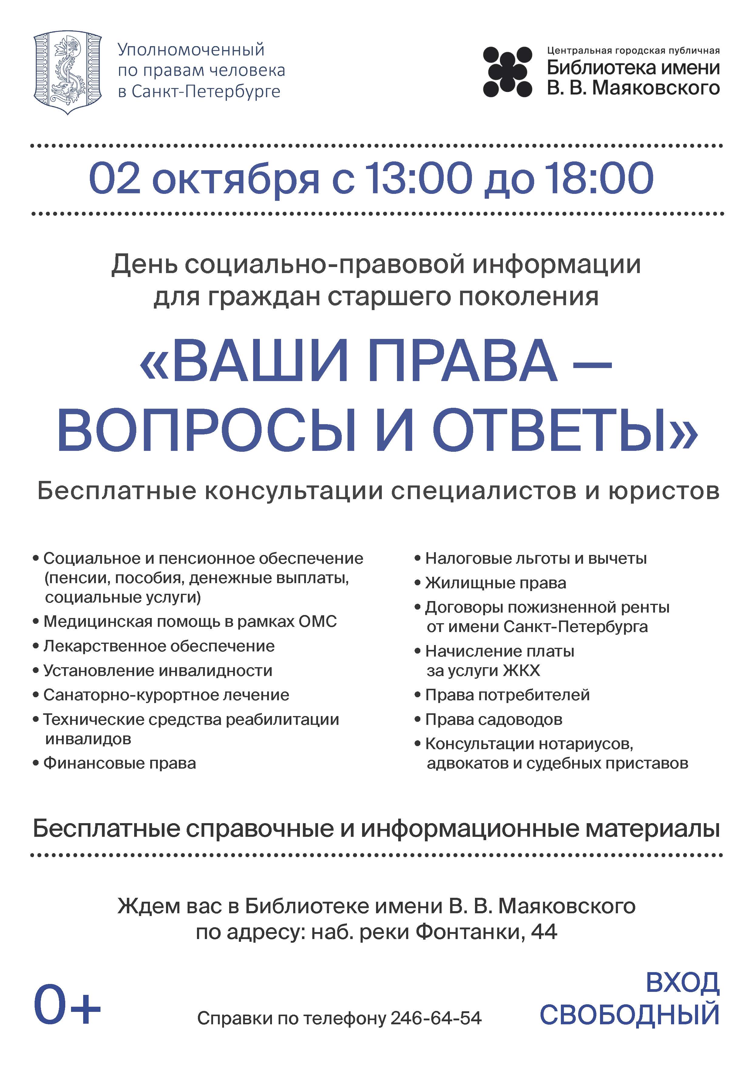 В этот день Уполномоченный по правам человека в Санкт-Петербурге совместно с Центральной городской публичной библиотекой им. В. В. Маяковского приглашают петербуржцев старшего поколения посетить мероприятие и получить индивидуальные консультации у специалистов и юристов.