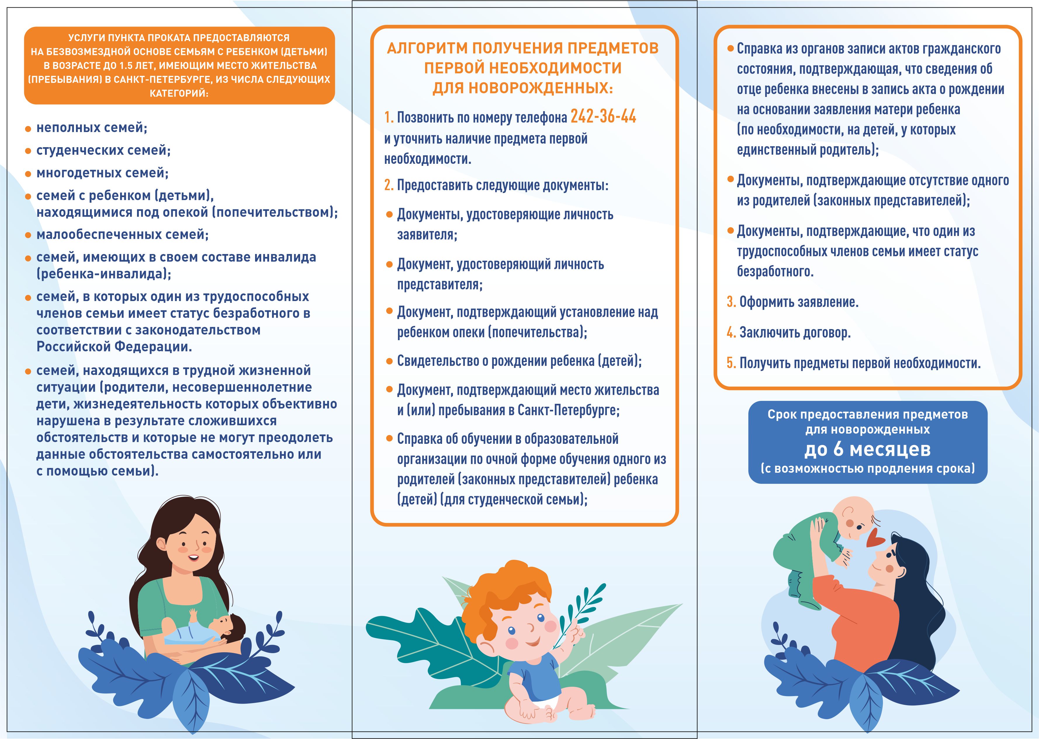 Услуги пункта проката предоставляются на безвозмездной основе семьям с ребенком (детьми) в возрасте до 1.5 лет, имеющим место жительства (пребывания) в Санкт-Петербурге, из числа следующих категорий:
