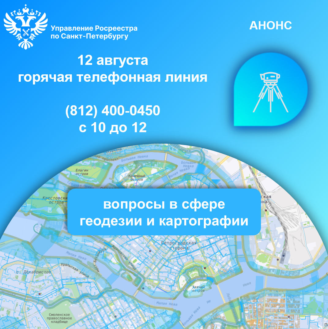 12 августа 2025 года с 10.00 до 12.00 часов Управление Росреестра по Санкт-Петербургу проводит горячую телефонную линию по вопросам в сфере геодезии и картографии.