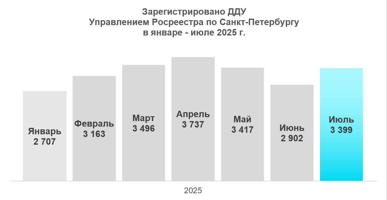 Общее количество зарегистрированных в июле 2025 года договоров участия в долевом строительстве – 3 399, всего за 7 месяцев зарегистрировано 22 821.