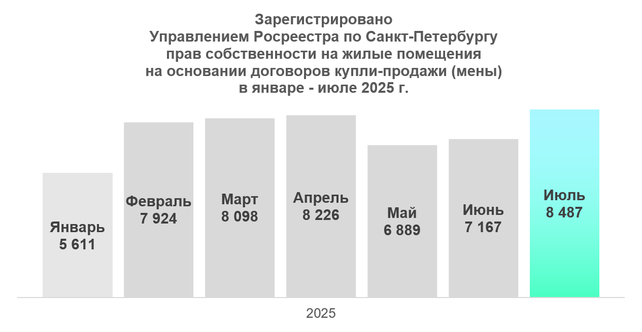 Количество зарегистрированных прав собственности в отношении объектов жилищного фонда на основании договоров купли-продажи/мены составило – 8 487. Это максимальное значение в 2025 году. За 7 месяцев зарегистрировано 52 402.