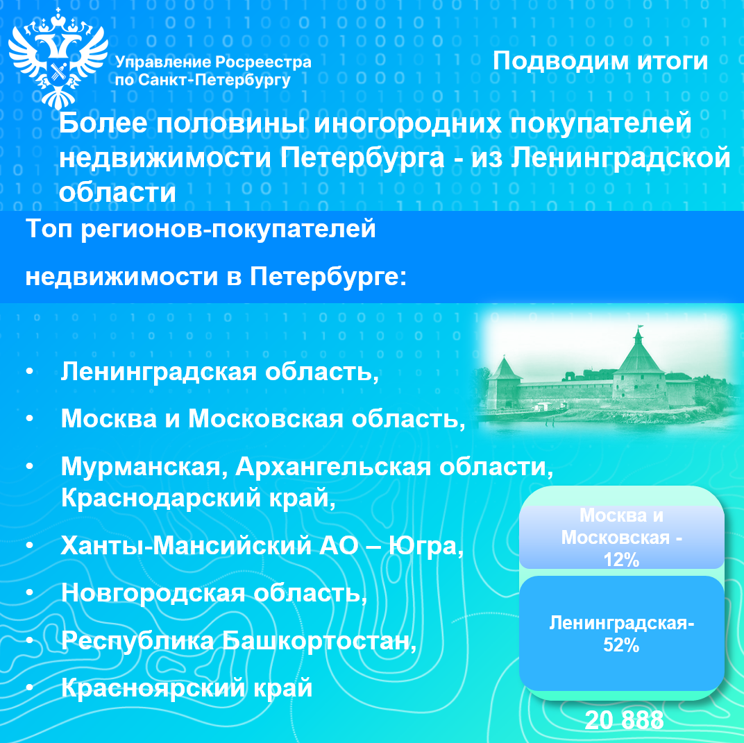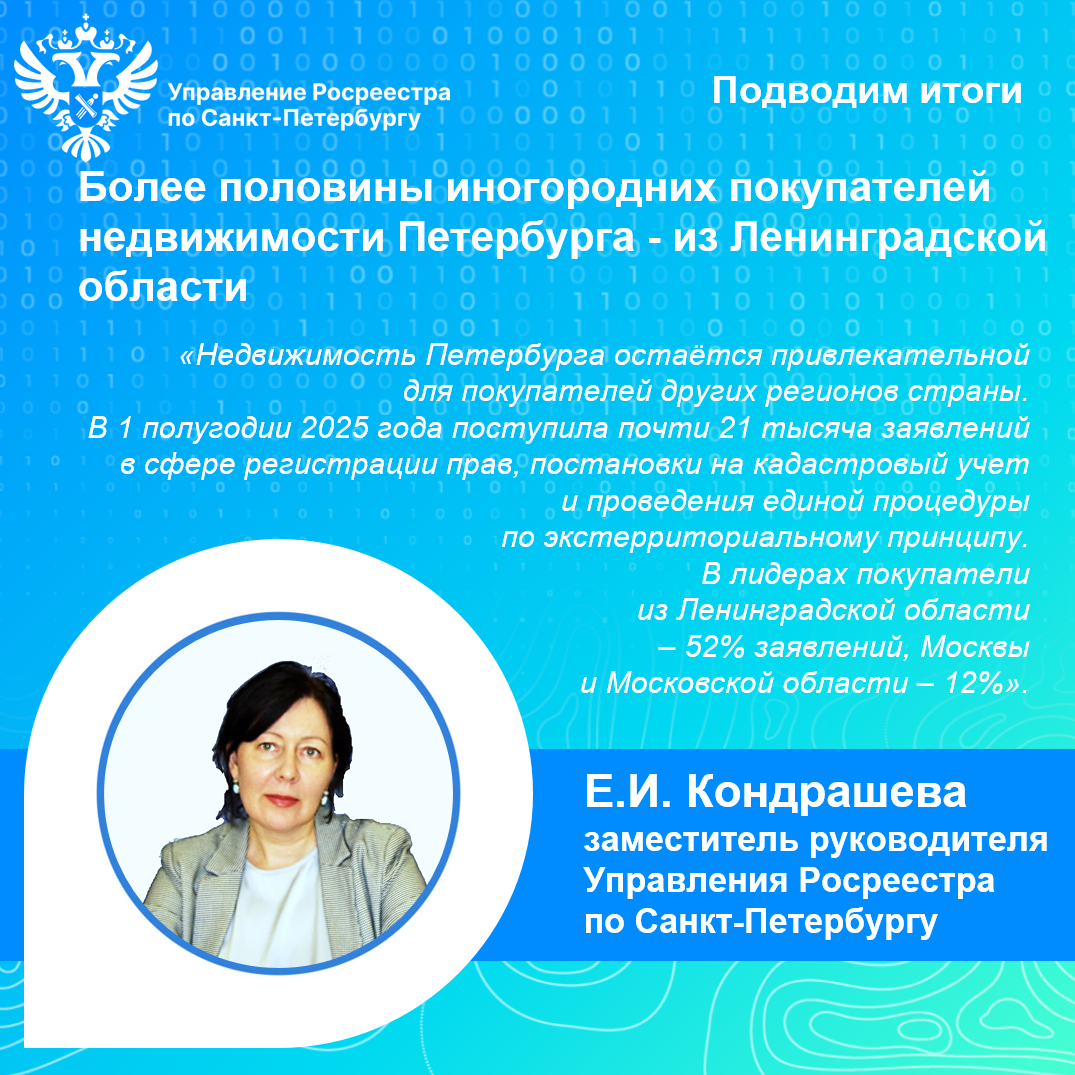 «Недвижимость Петербурга остаётся привлекательной для покупателей других регионов страны. В 1 полугодии 2025 года поступила почти 21 тысяча заявлений в сфере регистрации прав, постановки на кадастровый учет и проведения единой процедуры по экстерриториальному принципу. В лидерах покупатели из Ленинградской области – 52% заявлений, Москвы и Московской области – 12%».