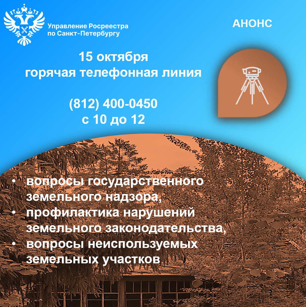 С 10:00 до 12:00 часов 15 октября 2025 года по телефону (812) 400-04–50 вам ответит заместитель начальника отдела государственного земельного надзора Константин Геннадьевич Тогулев.