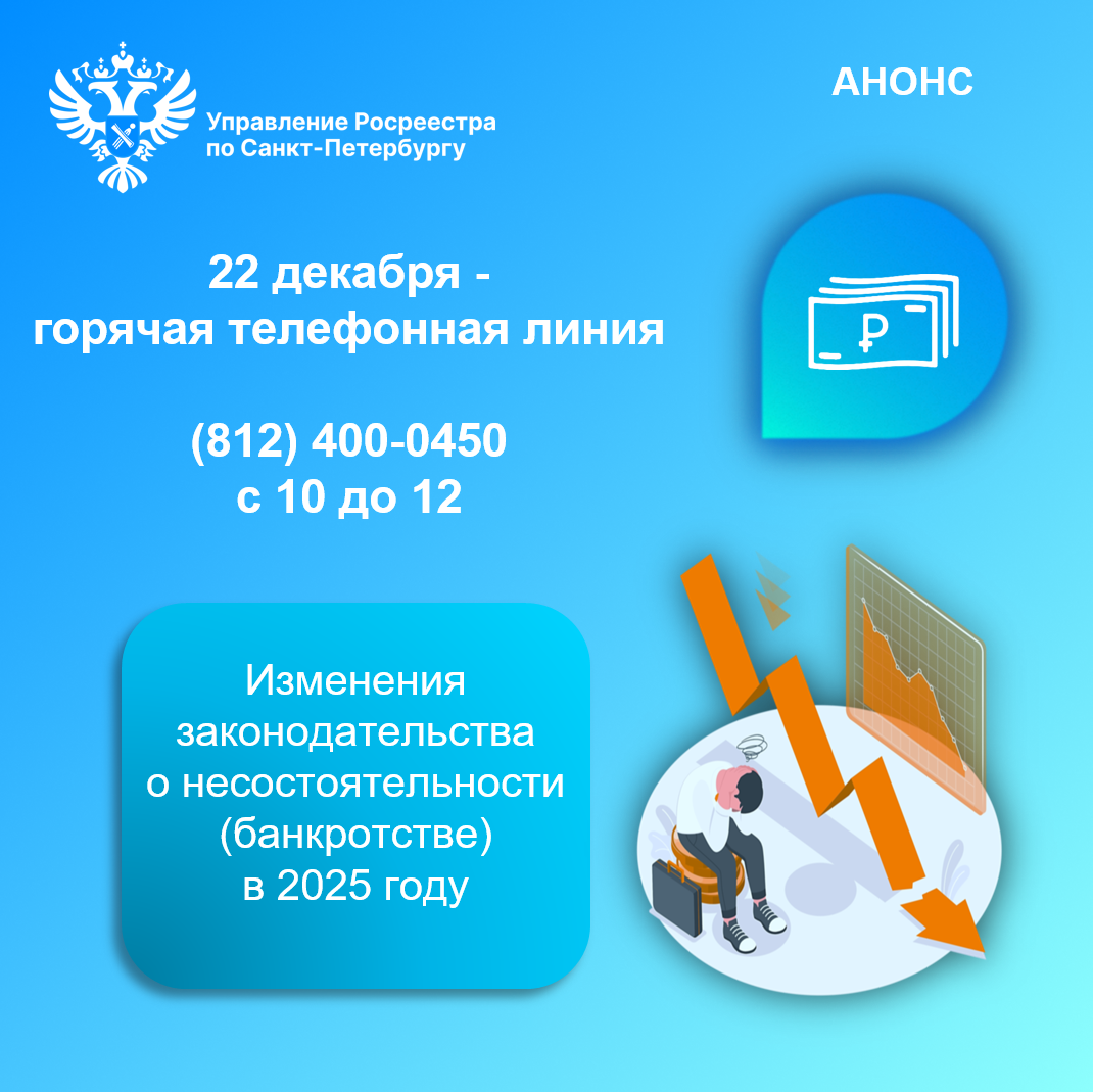 22 декабря 2025 года с 10.00 до 12.00 часов Управление Росреестра по Санкт-Петербургу проводит горячую телефонную линию на тему «Основные изменения в законодательстве о несостоятельности (банкротстве) в 2025 году»
