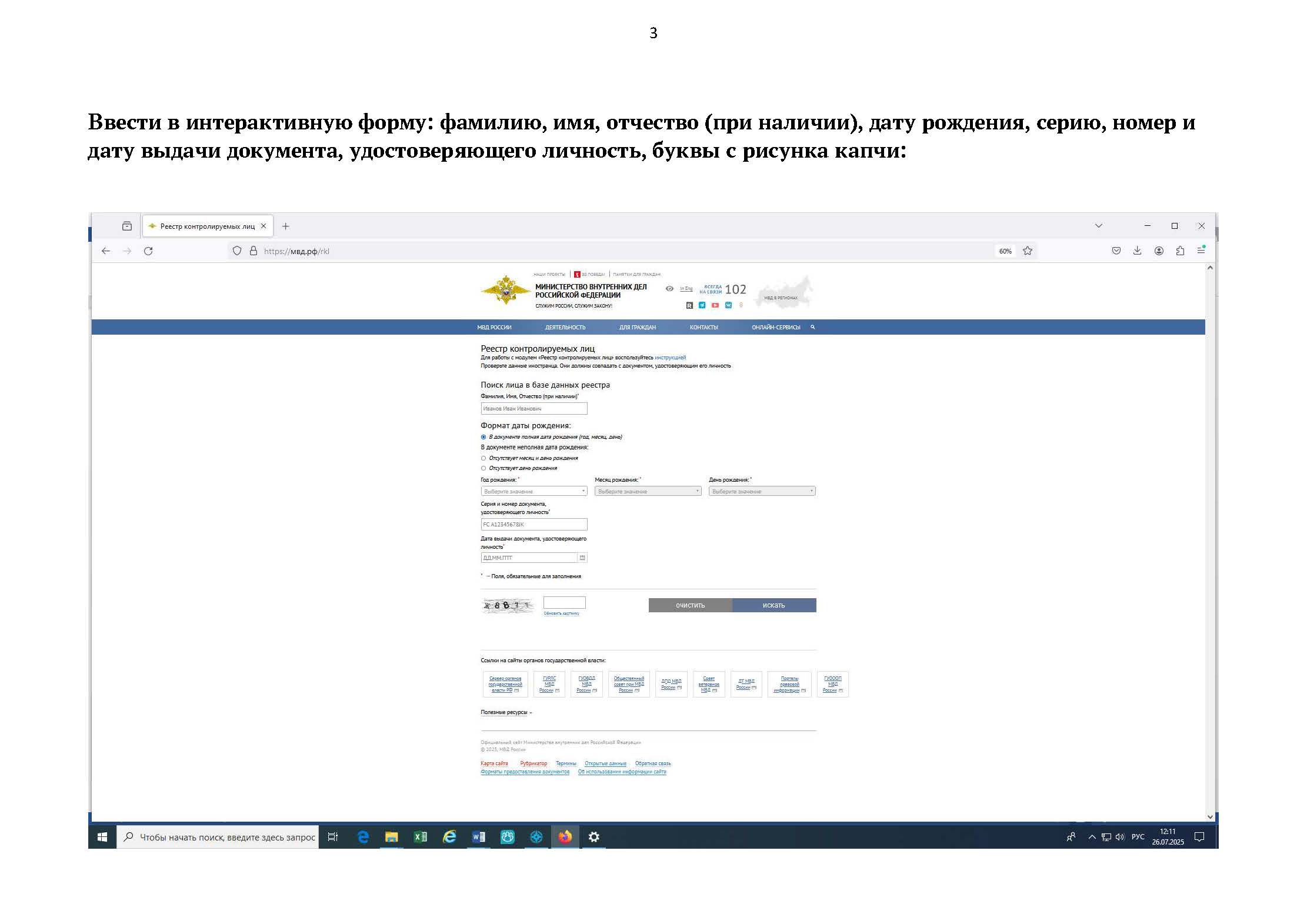 В этой связи при трудоустройстве иностранного гражданина важно ознакомиться с информацией на сайте МВД России о наличии сведений о нем в реестре контролируемых лиц. Для этого необходимо ввести в интерактивную форму фамилию, имя, отчество (при наличии), дату рождения, серию, номер и дату выдачи документа, удостоверяющего личность. В ответ будет выдаваться сообщение о нахождении человека в реестре или об отсутствии сведений о нем. Сведения на сайте обновляются каждые 4 часа.