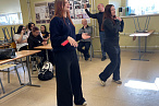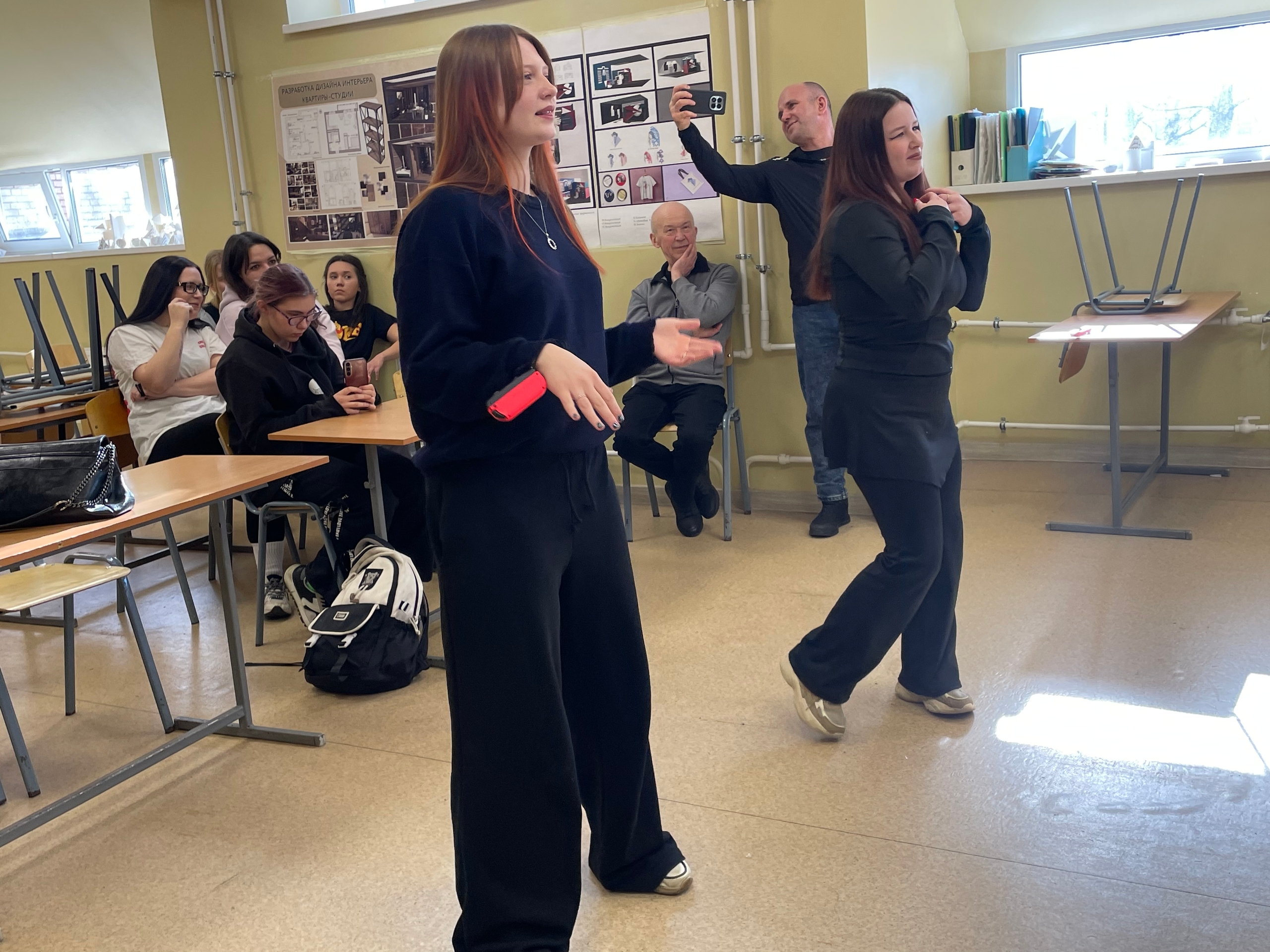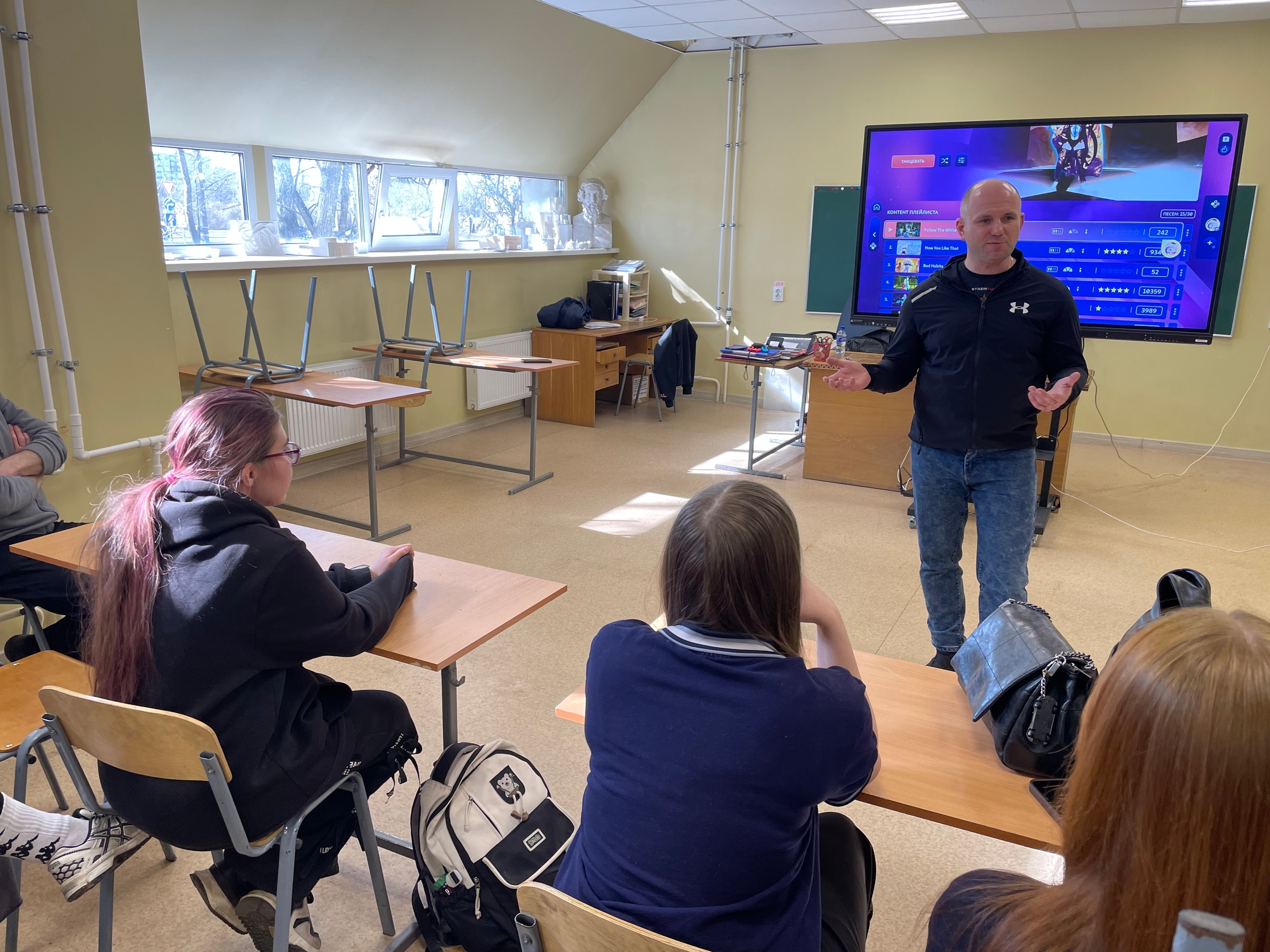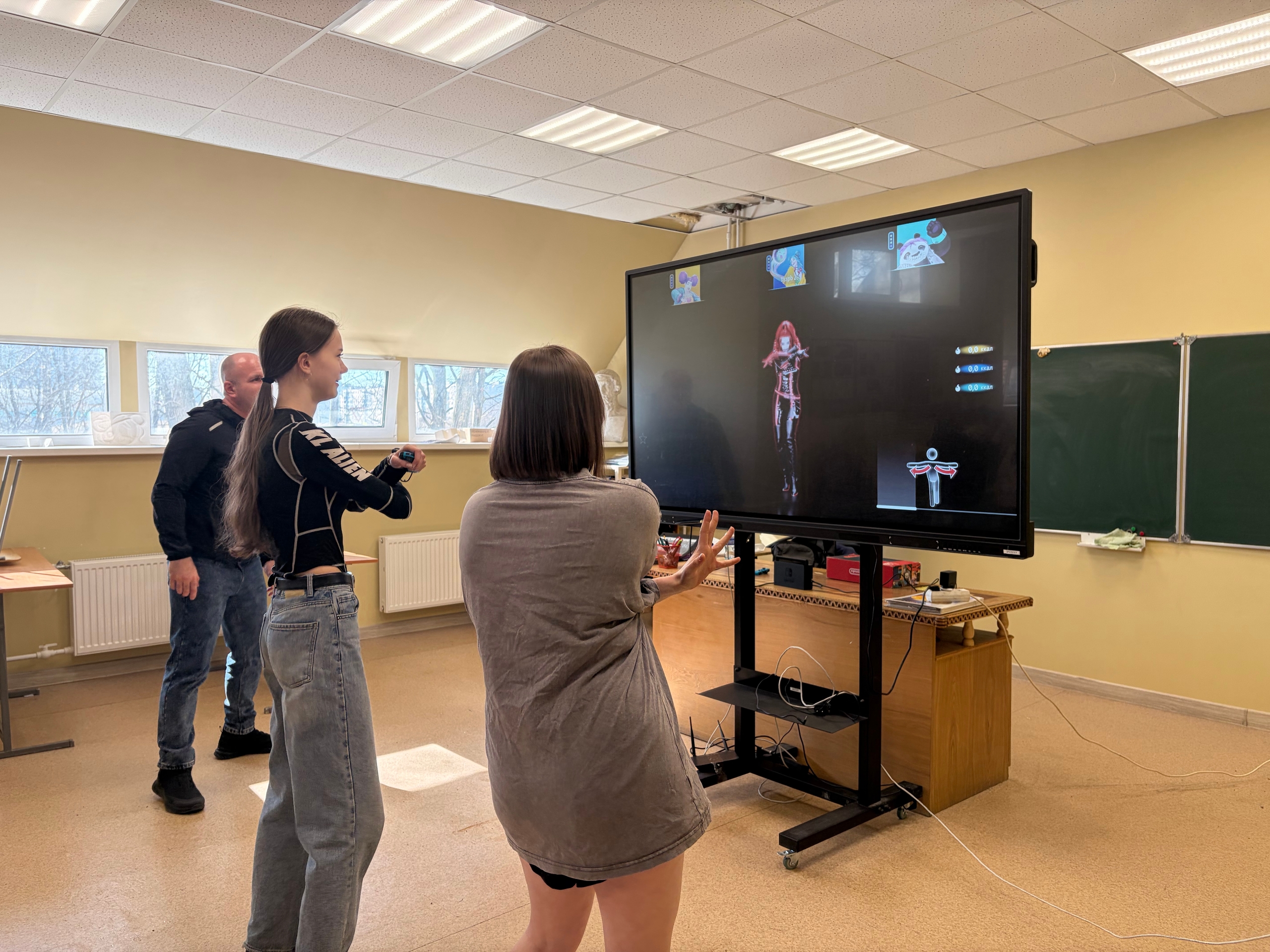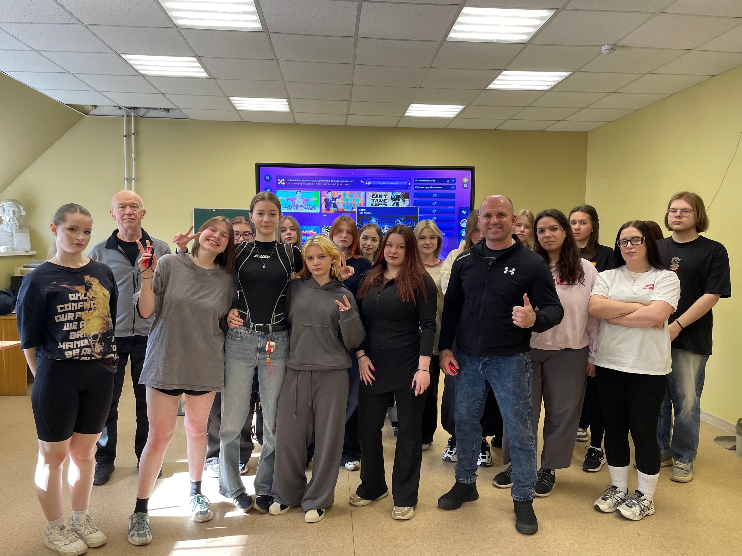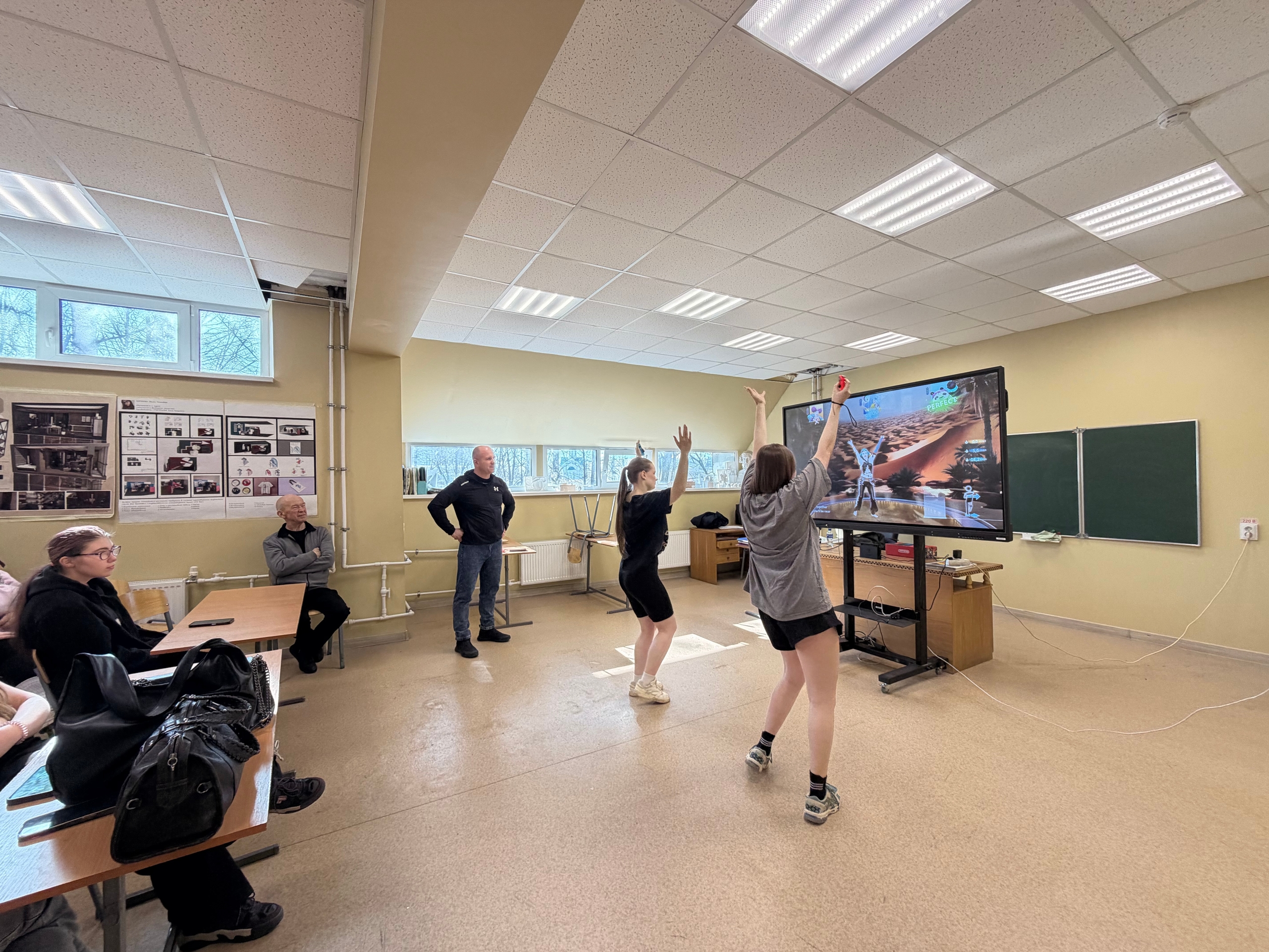 На этот раз студенты погрузились в дисциплину «ритм-симулятор» (фиджитал-танцы). После краткой лекции и инструктажа ребята сыграли в интерактивную игру Just Dance. Задача простая и занимательная: повторять движения персонажа под популярные треки, чтобы набрать максимум очков.